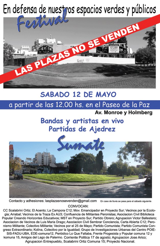 Bajo la consigna Las plazas no se venden. Se defienden, vecinos y agrupaciones sociales, vecinales y políticas se reunirán en la esquina de Monroe y Holmberg, en rechazo a la venta del Paseo de la Paz con el objetivo de concretar un emprendimiento inmobiliario.