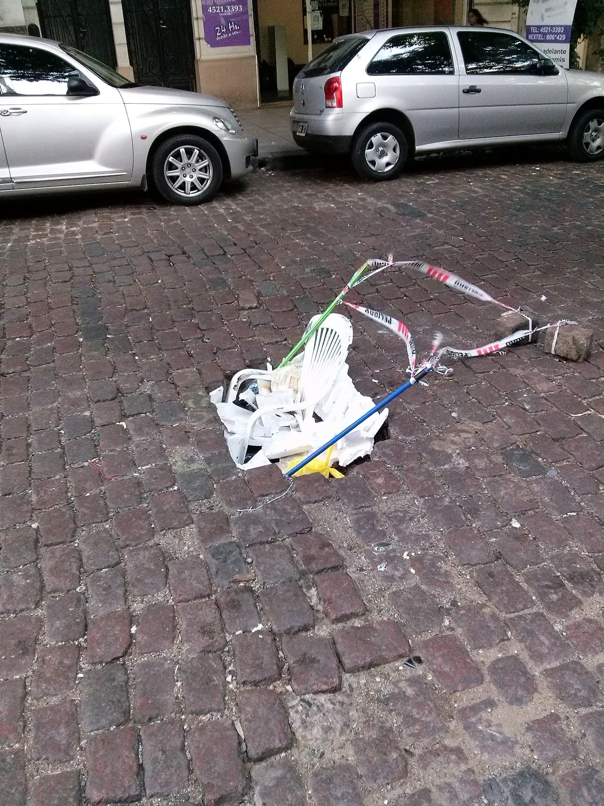 El bache se encuentra en la calle Bauness al 2300 los vecinos como prevención lo han llenado con escombros, y hasta con un silla, la cual solo puede verse el respaldo, dada la profundidad del mismo, increible…!!!